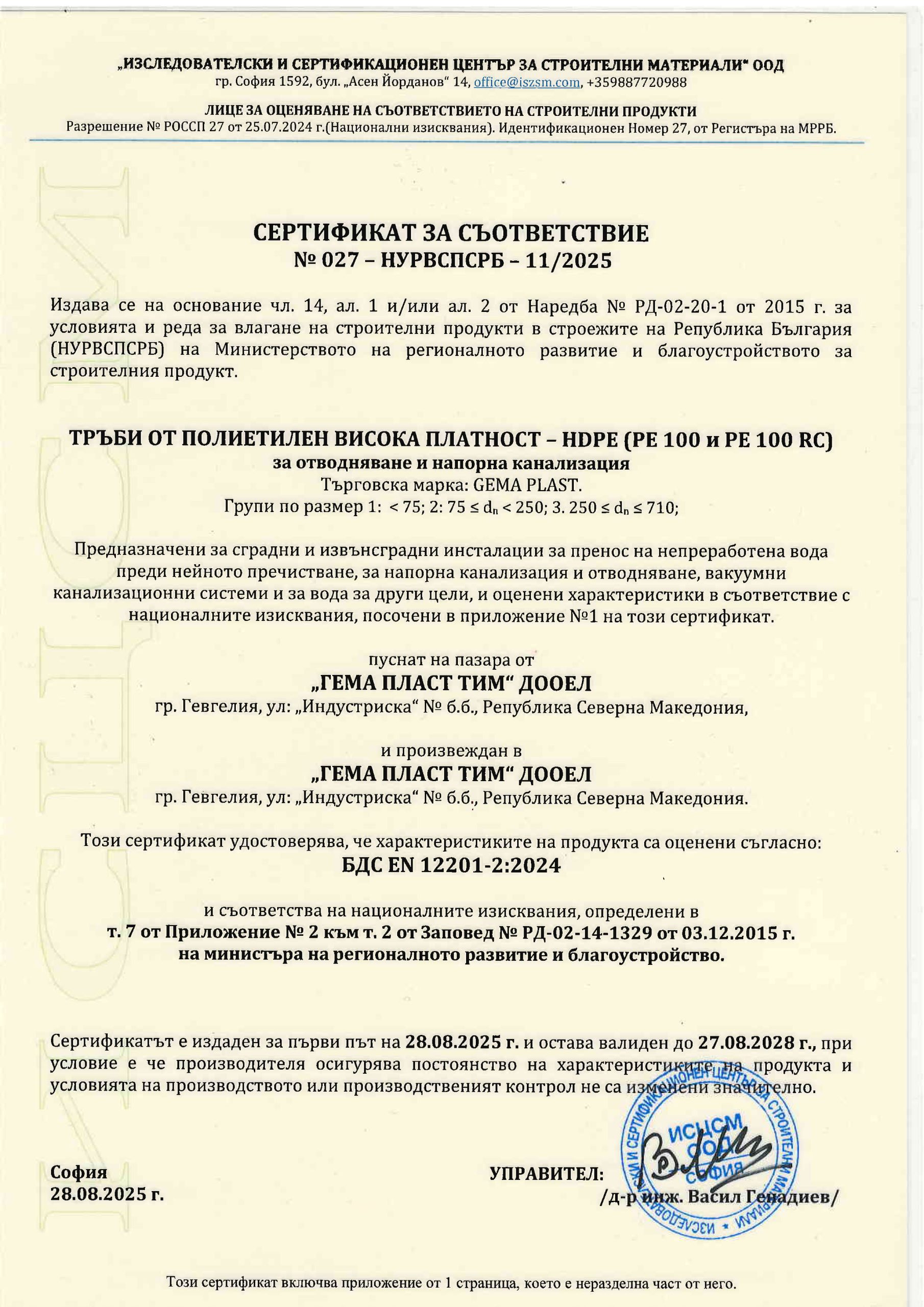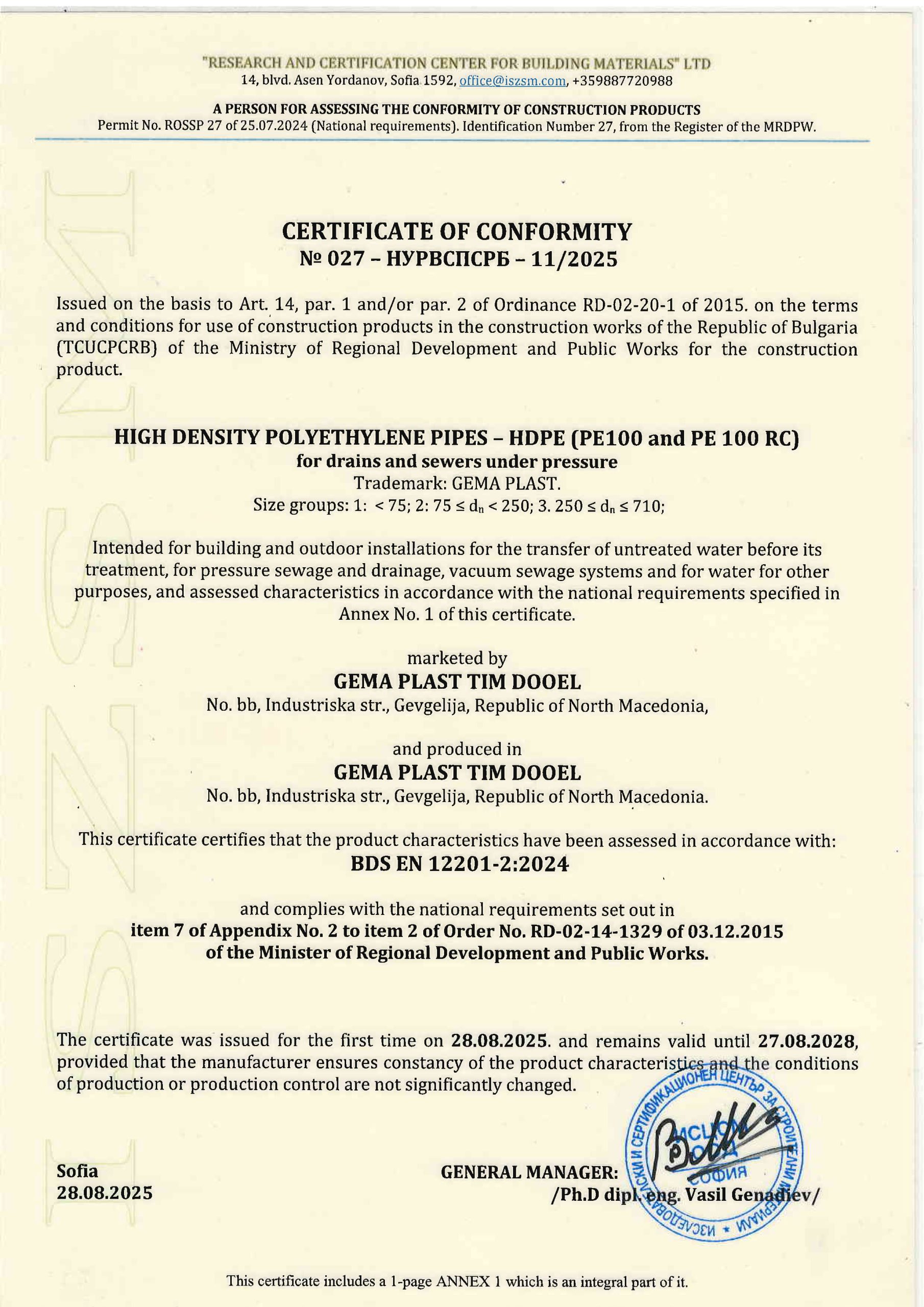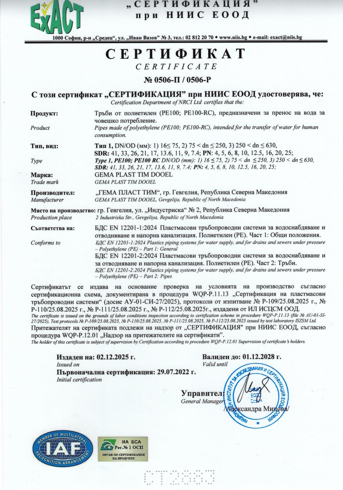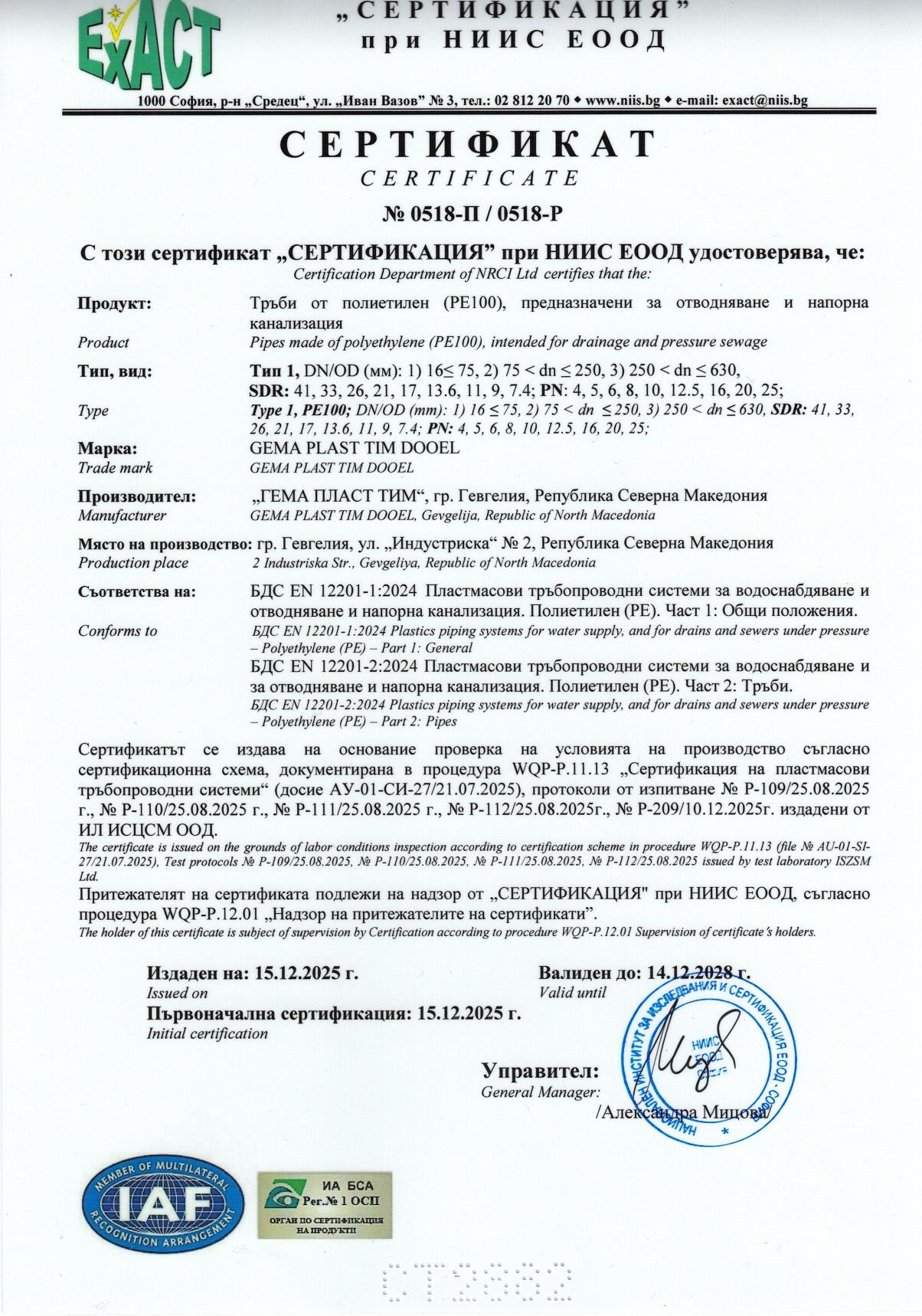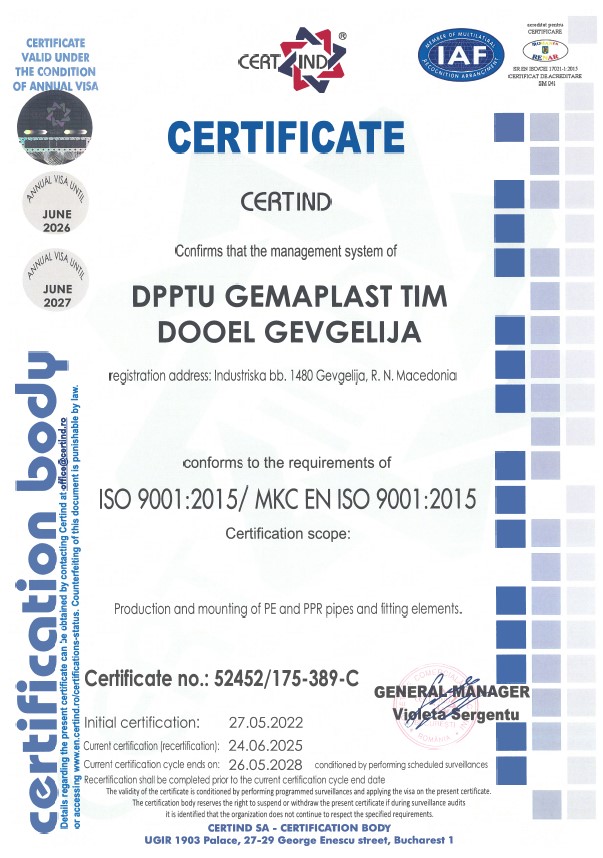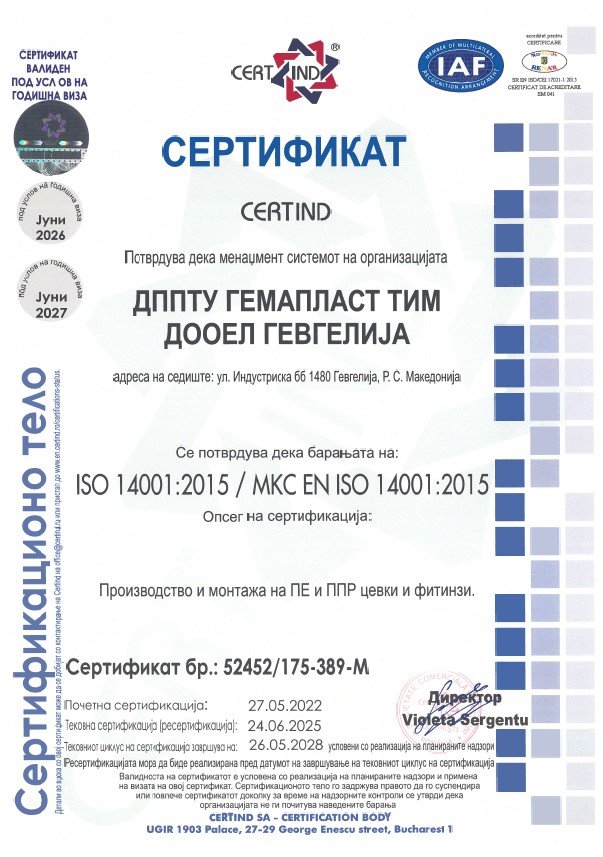 Нашата компанија е сертифицирана и ги поседува сертификатите ISO 9001:2015 – сертификат за систем за управување , ISO14001:2015 – сертификат за системот за управување за заштита на животната средина  како и EXACT сертификатот кој е за квалитет на производот , а епризнат насекаде во светот.
